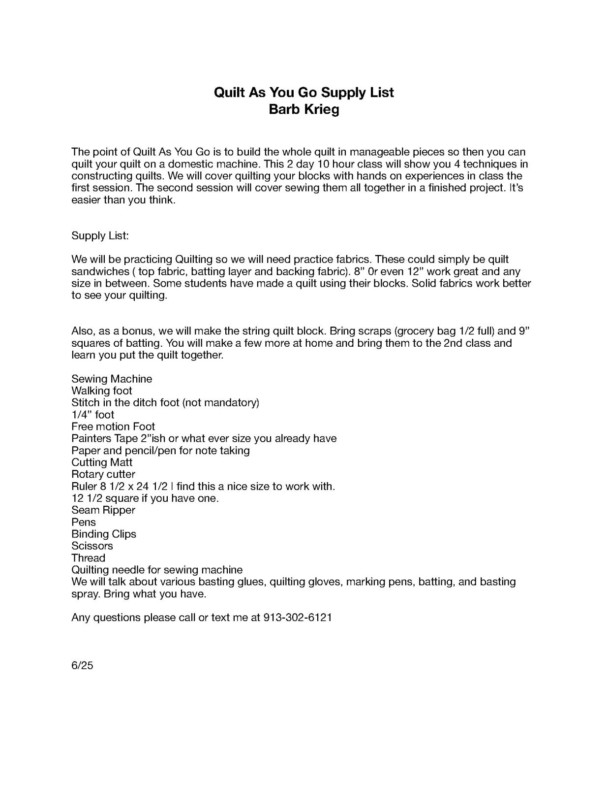 The point of Quilt As You Go is to build the whole quilt in manageable pieces so you can quilt your quilt on a domestic machine. This 2 day class will show you 4 techniques in constructing quilts. We will cover quilting your blocks with hands on experiences in class the first session. The second session will cover sewing them all together in a finished project. It’s easier than you think.
