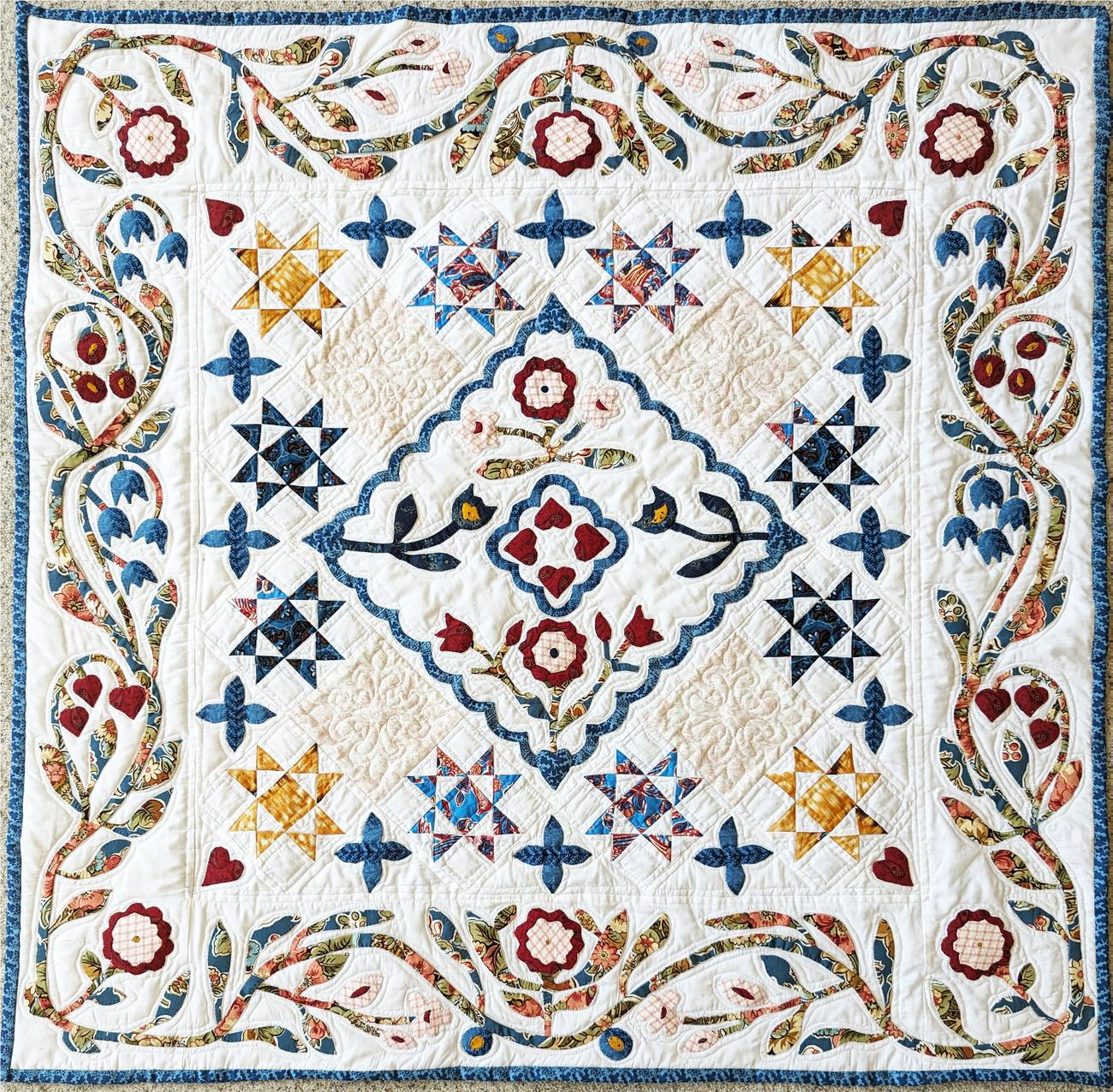 In this continuing class, we will learn a variety of techniques: needle turn applique, cut-away applique, and hand piecing. Our project for this year, when completed, is about 40” square, and was inspired by an 1846 dated quilt featured in the book, Hidden Treasures: Quilts from 1600 to 1860 by Kay and Lori Triplette. While the sample quilt is primarily blue and yellow, consider your own color palette. Notice, the border vine is all one multicolor fabric that determines the color palette for the sample quilt. $66 for four class sessions.